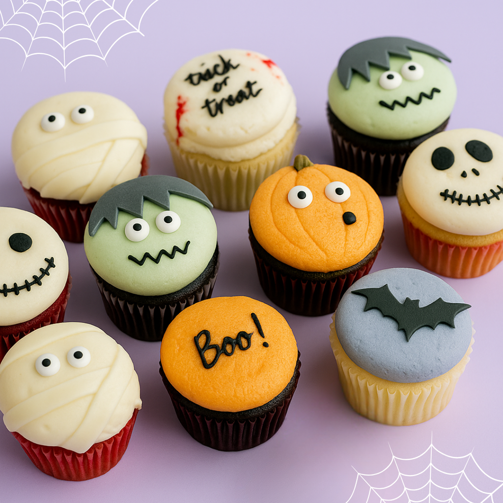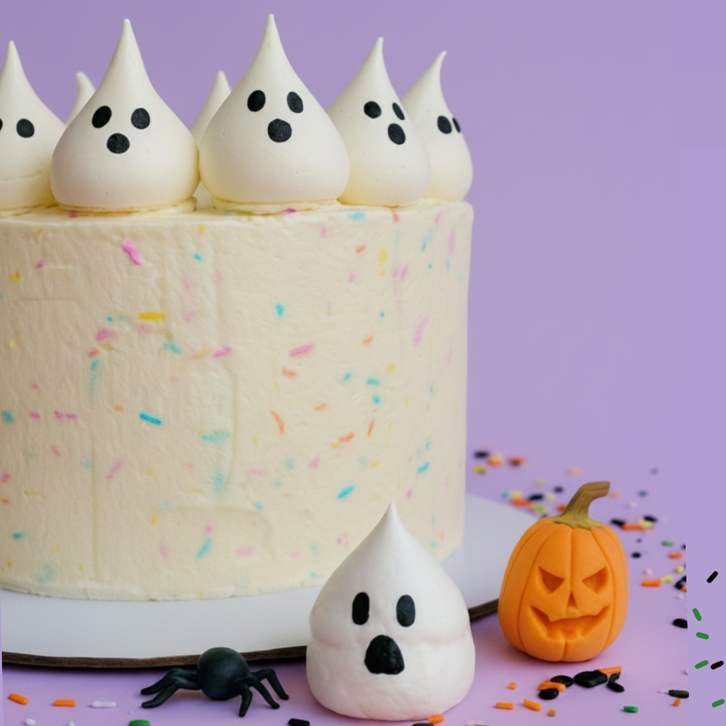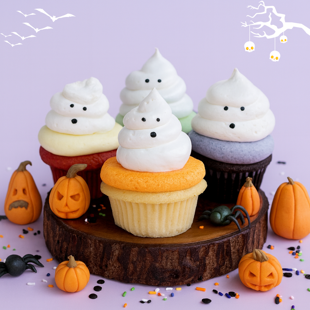 Our classic cupcakes, dressed spooky-cute and topped with meringue ghosties.